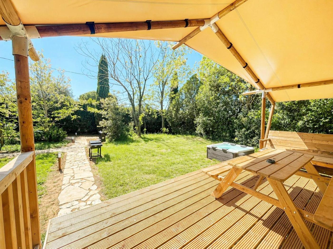 Tenda. This tent features a hot tub. Guests will find a stovetop, a refrigerator, kitchenware and a microwave in the fully equipped kitchen. The tent also comes with a barbecue. This air-conditioned tent has a seating area, a patio, garden views and a private bathroom. The unit has 3 beds. ;