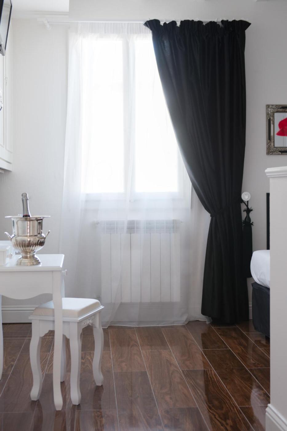Camera Matrimoniale. Camera matrimoniale dotata di aria condizionata,per la preparazione di tè e caffè e bagno privato con doccia a filo pavimento e asciugacapelli. Inoltre dispone di armadio, TV a schermo piatto, vista sul cortile interno e cioccolato in omaggio. L’alloggio presenta 1 letto. ;