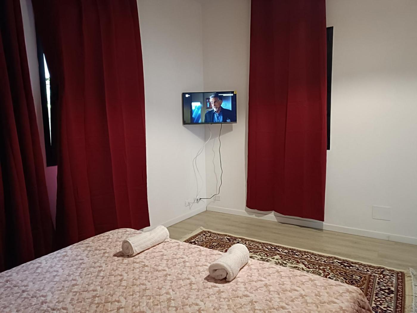 Camera Matrimoniale Budget. Camera matrimoniale provvista di aria condizionata, lavatrice, balcone con vista sulla città e bagno in comune con vasca. L’alloggio dispone di 1 letto. ;